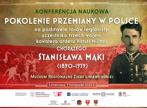 POKOLENIE PRZEMIANY W POLSCE. KONFERENCJA NAUKOWA I WYSTAWA - to wydarzenia wieńczące projekt "POKOLENIE PRZEMIANY W POLSCE", które miały miejsce w Muzeum Regionalne Ziemi Limanowskiej 7 listopada 2025 r. Kanwą do dyskusji są losy bohatera - chorążego Stanisława Mąki, który pochodził z Ziemi Limanowskiej, walczył w legionach, a potem - już jako zawodowy żołnierz - w wojnie polsko-bolszewickiej. Zginął 17 września 1939 r. broniąc polskiego wybrzeża.