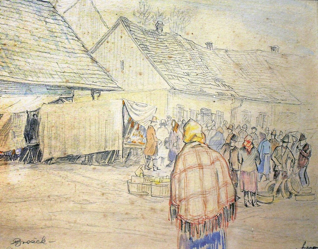 Maksymilian Brożek. Stragany na limanowskim rynku podczas jarmarku. Rysunek. Fot. Karol Wojtas